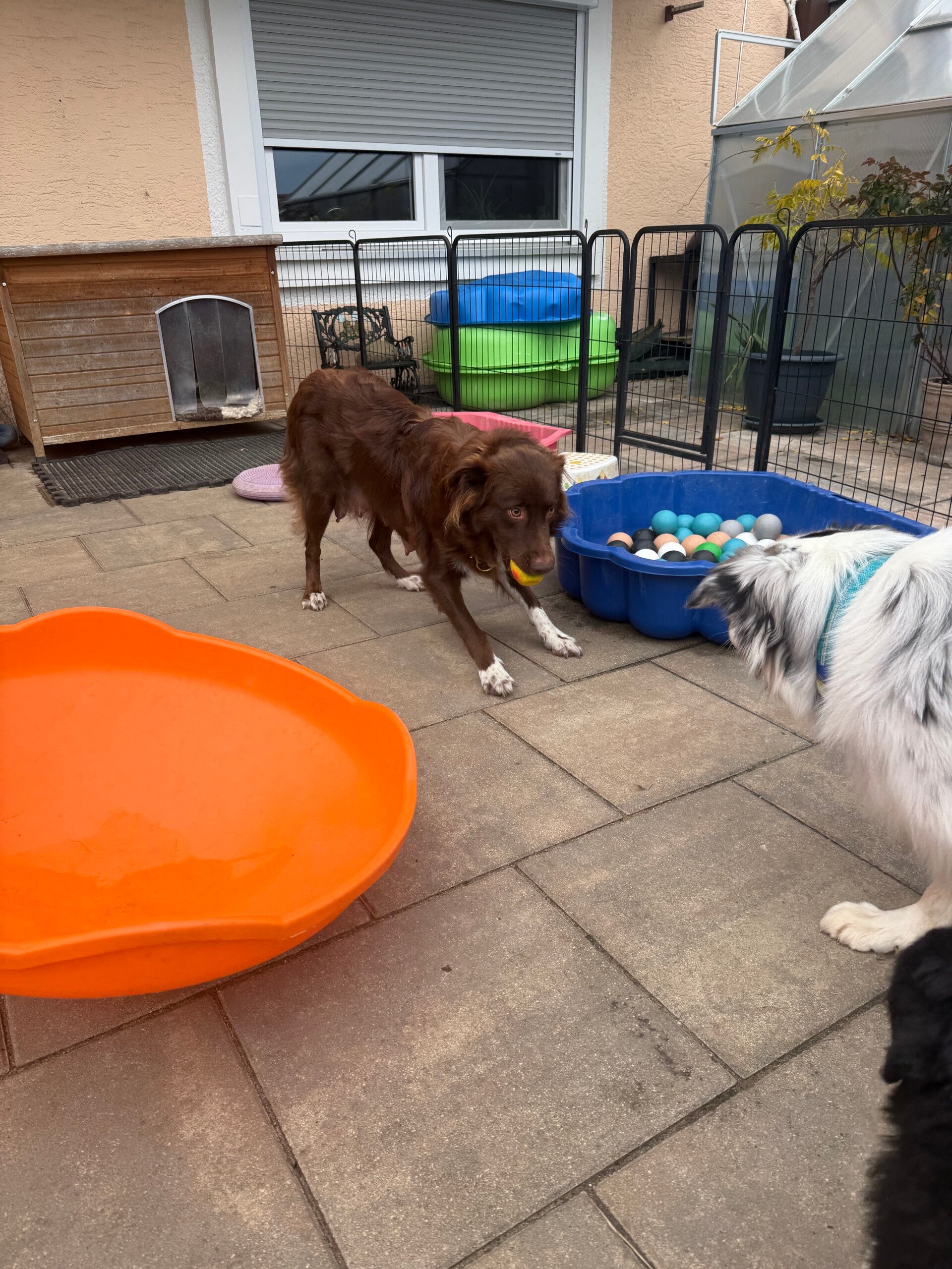 Desensibilisierung läuft weiter: verschiedene Geräusche, Gerüche und Untergründe werden behutsam eingeführt. Im Welpengehege gibt es u. a. eine kleine Wackelmatte für das Körpergefühl, eine Strandmuschel mit Kuschelkissen als Rückzugsort sowie eine Hundehöhle. Ein Sandkasten steht bereit – er wird aktuell (Woche 4) eher neugierig begutachtet als aktiv genutzt.