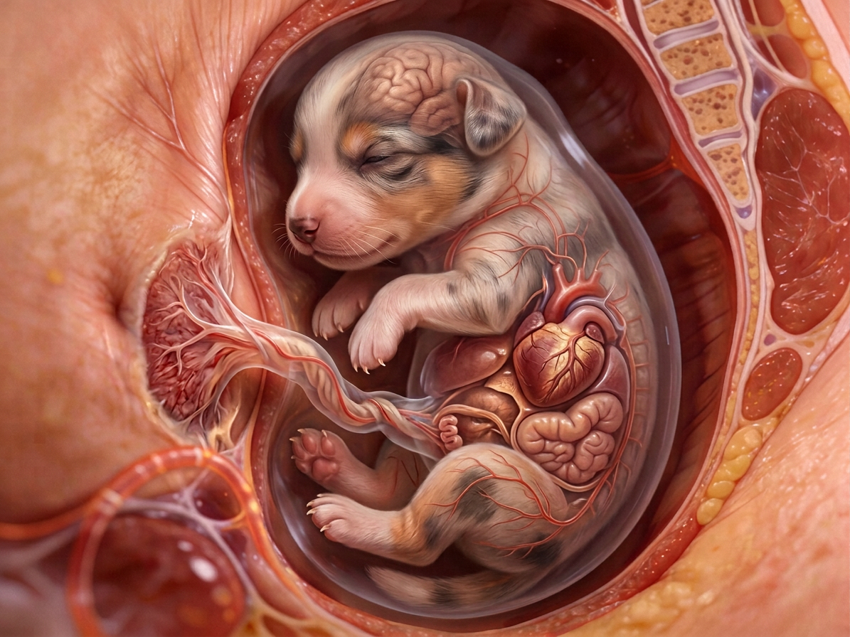 Die kleinen Welpen haben jetzt winzige Köpfe, Rückgrate, Augenbläschen und beginnen sogar, Beinansätze zu bilden. Auch das Herz schlägt bereits kräftig, und die Verbindung zur Mutter über die Plazenta funktioniert vollständig – damit bekommen sie nun alle Nährstoffe, die sie für ihr schnelles Wachstum benötigen.